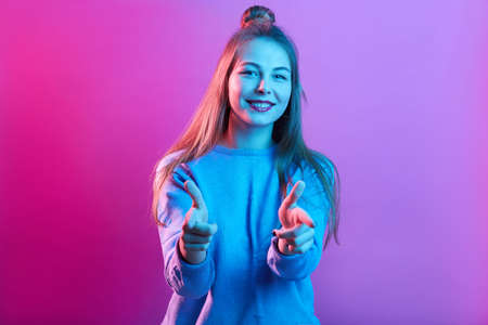 Winsome lady standing isolated over pink neon background and pointing directly to camera with her index finger finger, expressing happiness, being in good mood.