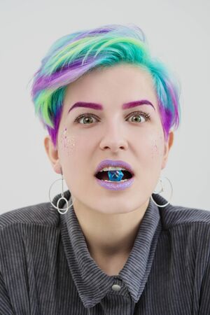 A young woman with short pixie bob haircut and dyed hair, holds in the mouth and in the hands gemstones and jewels. White background in a bright room.