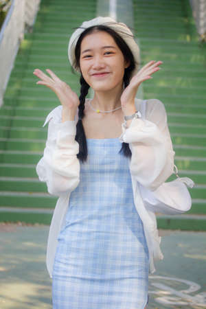 asia thai teen blue dress beautiful girl smile and relax