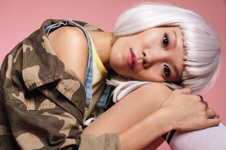 Image of young asian girl wearing white wig sitting with head on knees and looking at camera isolated over pink background