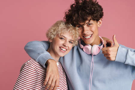 Happy young couple of teenagers standing isolated over pink background, wearing t-shirts, hugging, having fun, thumbs up