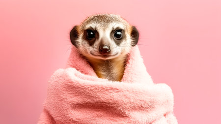 A cute meerkat wrapped snugly in a towel after a refreshing bath, adding warmth and charm against a colorful backdrop.