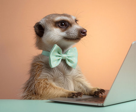 Meerkat in a bow tie reviews analytics and prepares for a business meeting during a sunny afternoon