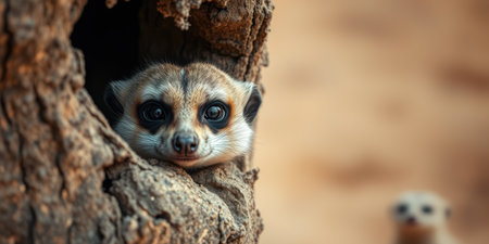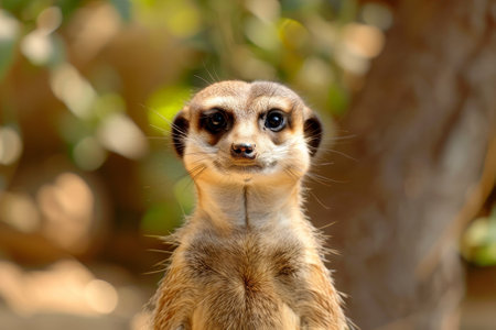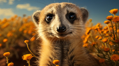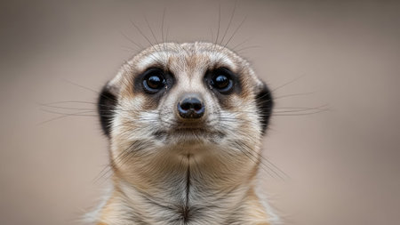 A charming close-up of a meerkat with soft fur, bright eyes, and an inquisitive expression. The warm background enhances the delightful and playful nature of this adorable animal.