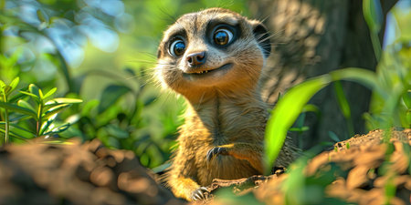 A charming meerkat stands alert on a sandy mound, bathed in soft golden light. The backdrop features vibrant greenery, contributing to a serene and natural environment.