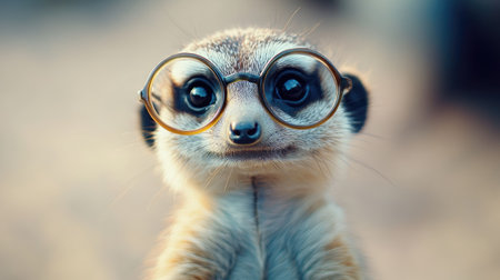 A charming meerkat sporting round glasses showcases a playful expression, capturing the essence of curiosity and whimsy in a wildlife portrait.
