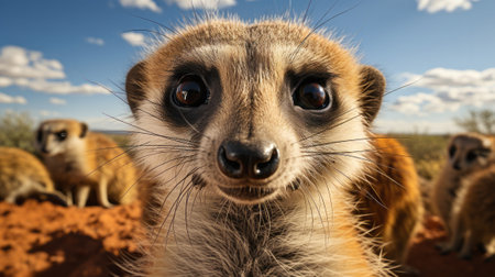 meerkats close-up shot, the intense gaze and curious nature of these charming animals. This photograph provides the meerkat's expressive face, highlighting its focused eyes and endearing features.