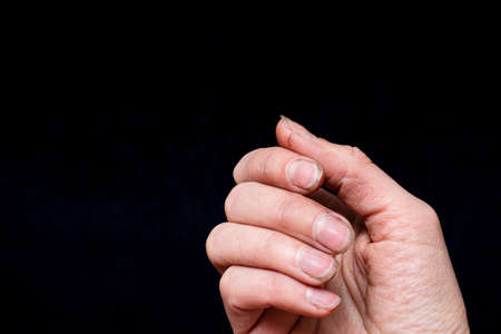 Close-up of female caucasian hand with dirty brittle nails, broken nails on a black background. Peeling on nails. Nail and hand care concept