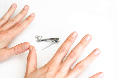 Trimmed nails of a young man. Manicures for men himself. On white background. Short fingernails. Hands. Close up.