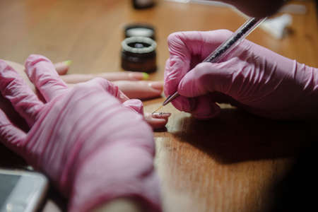 Manicure. Master applies varnish drawing on nails gel in manicure salon.