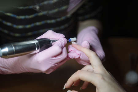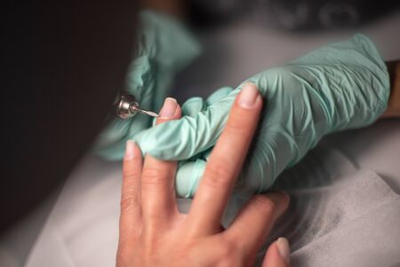 Close Up shot of hardware manicure in a beauty salon. Manicurist in protective gloves is applying electric nail file drill to manicure on female fingers