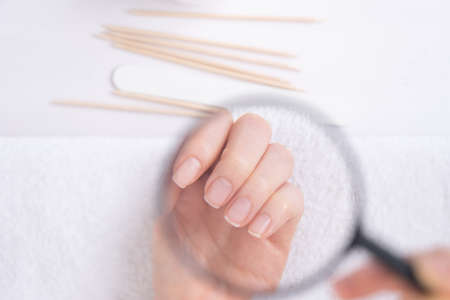 We examine the nails on the female hand through a magnifying glass. Attention to the condition of nails and skin. Nearby are manicure items, orange tree sticks and a nail file