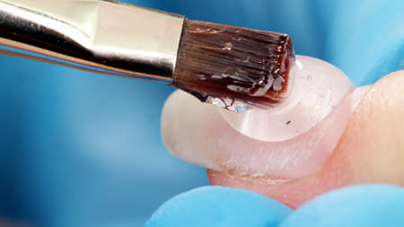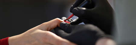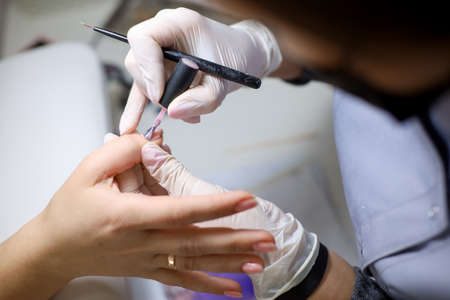 The manicurist applies varnish on the nail close-up. Coating the nail with varnish