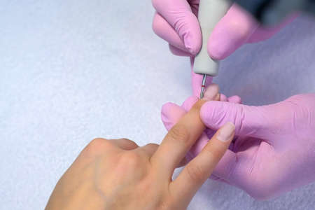 Hardware manicure in a beauty salon. Female manicurist is applying electric nail file drill to manicure on female fingers. Mechanical manicure close-up. Body care.