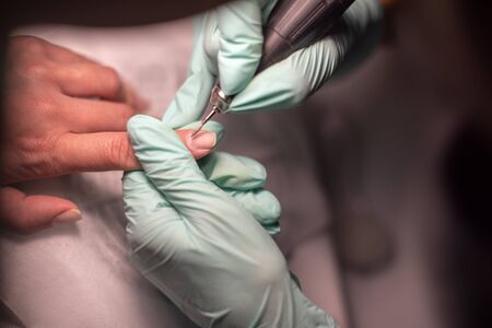 Closeup shot of hardware manicure in a beauty salon. Manicurist is applying electric nail file drill to manicure on female fingers.