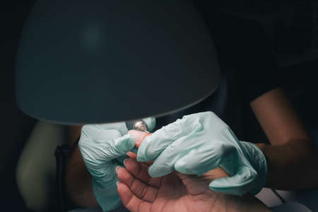 Manicure process in a beauty salon. Hands of the master in sterile gloves polished nails client.