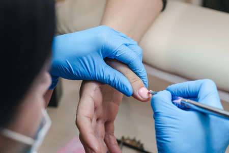 Nail master in rubber gloves make manicure (care cuticle) on a woman hand finger nail. Healthcare beauty cosmetic spa procedure in a salon