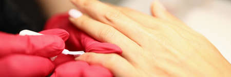 The client is undergoing a procedure with a manicure master. Manicurist apply gel polish to nails