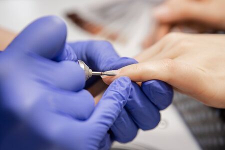 Woman use electric nail file drill in beauty salon. Nails manicure process in detail. Gel polish.