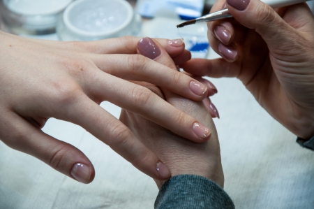 The master of nail extensions and coating with gel varnish makes correction to his client in the beauty salon