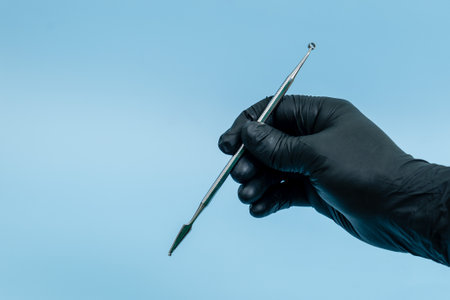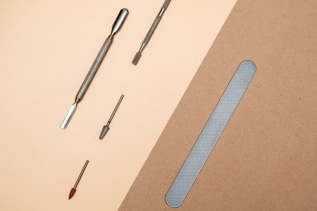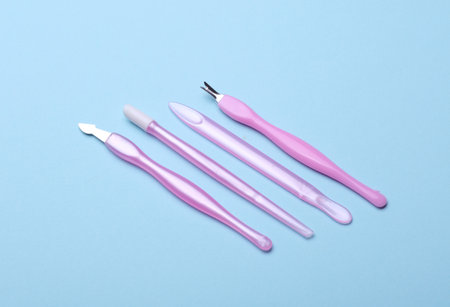 Set of disinfected manicure or pedicure tools. Cuticle pushers for safe hygiene, beauty and nails care. Top view. Copy space.