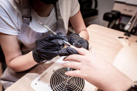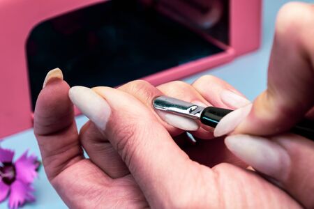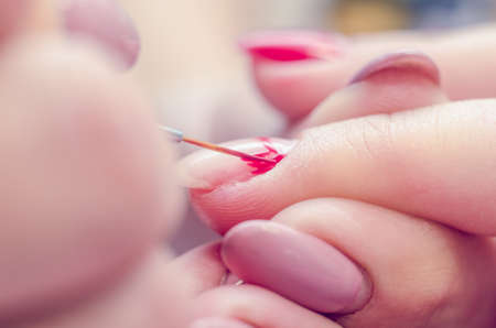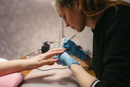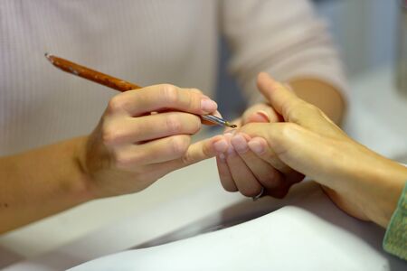 Manicure. Master applies varnish drawing on nails gel in manicure salon.