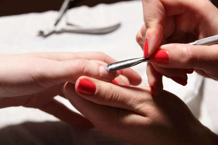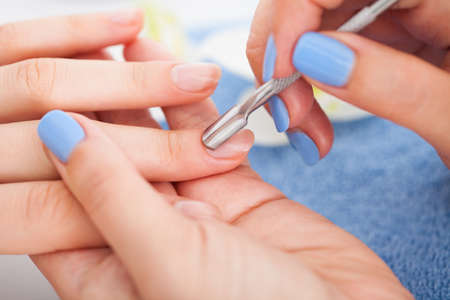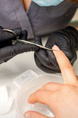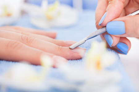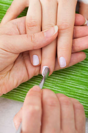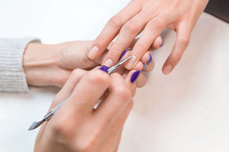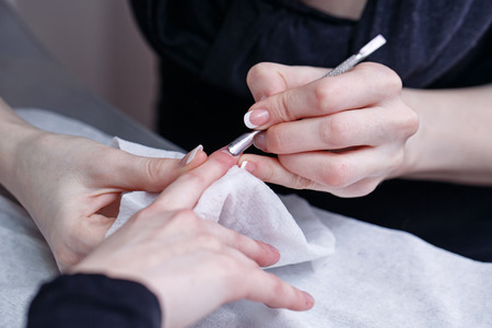 Woman hands receiving manicure and nail care procedure. Close up concept. Manicurist pushing cuticles on female's nails. female nail manicure processing.