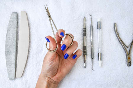 Trim the nails on the hand. Do yourself a manicure. Shorten long nails. Home nail care, Spa, beauty. Manicure tools on a white towel. Procedure, nail salon. Tweezers, nippers, pusher, orange stick