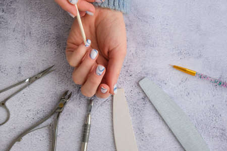 Home manicure. Self-treatment of nails during the pandemic and quarantine. Cuticle removal with a special tool.