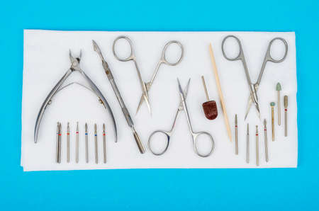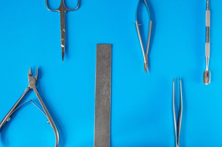 Manicure and pedicure tools on blue background. Nail file, scissors, tweezers pusher, nippers. Medical tools top view.
