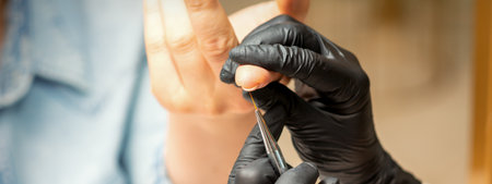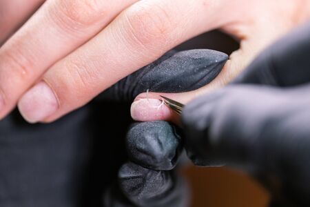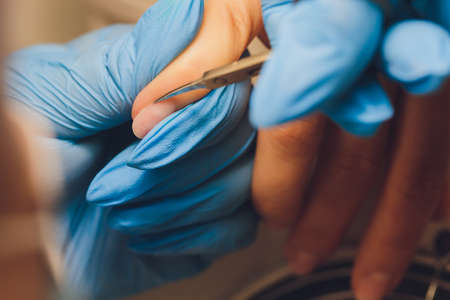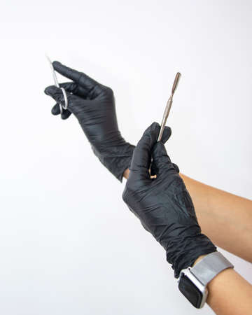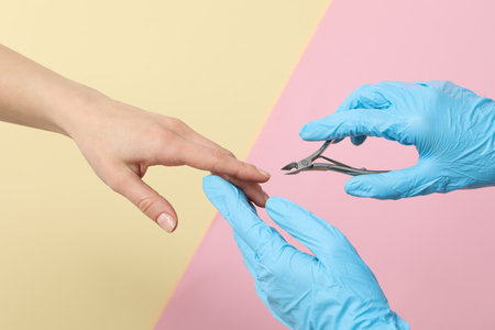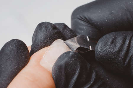 Gloved manicurist uses nippers to cut cuticles on nails. Manicure and pedicure tools concept.