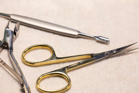 A set of tools for manicure on a white napkin. Can be used as a background. Close-up