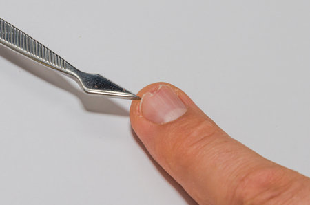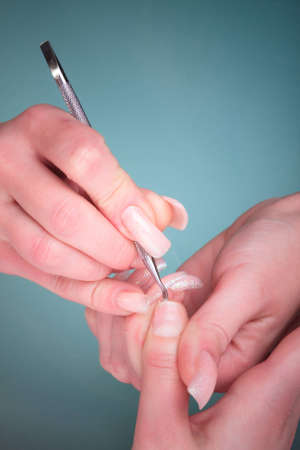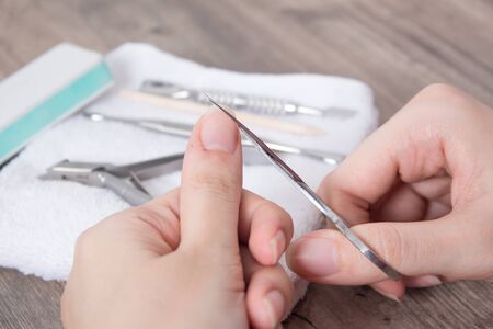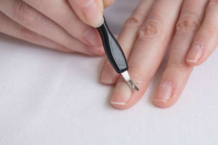 Woman using a cuticle pusher on her nails. Nail preparation process before applying polish.