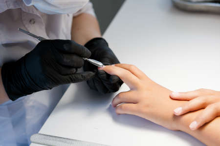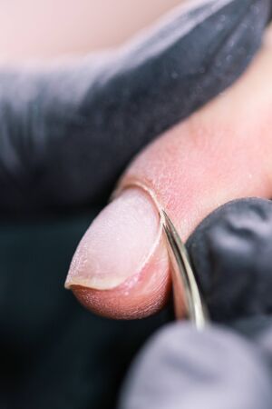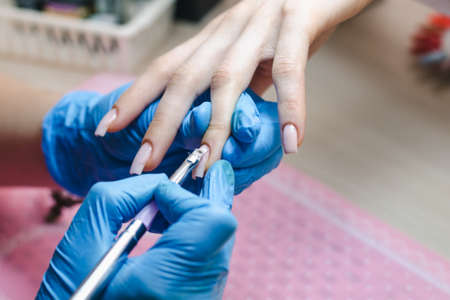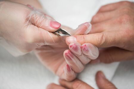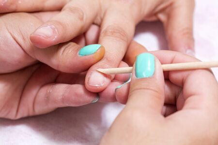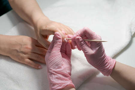 Manicurist removes the base coat from the nail with an orange stick during the manicure procedure at the Spa. Close up.
