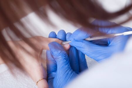 Manicurist makes manicure in blue gloves for client in beauty salon. Pushing cuticle with spatula. Medicine, cosmetology and manicure.