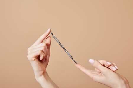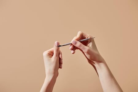 Cropped view of woman doing manicure using cuticle pusher isolated on beige