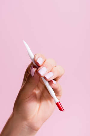 Female hand and orange stick. Cuticle retraction during manicure. Nail care at home.