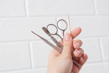Hold manicure tools in your hand. Nail care, procedure, nail salon. Tweezers, wire cutters, pusher, orange tree stick, scissors, nail file. Pedicure, cuticle removal. Home care, Spa, beauty.