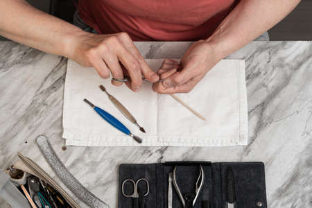 A woman makes herself a manicure, removes the cuticle skin on her nails, takes care of her nails. Preparing the cuticle for cleaning and trimming. Top view very close up