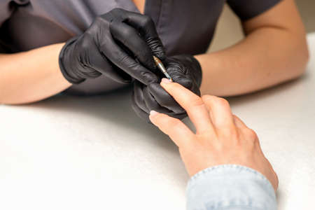 Hardware manicure in a beauty salon. Female manicurist is applying electric nail file drill to manicure on female fingers. Mechanical manicure close-up. Body care.
