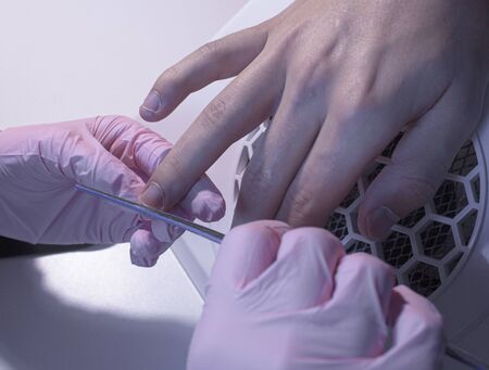 Finger nail treatment, grinding and polishing in beauty salon. Manicure process