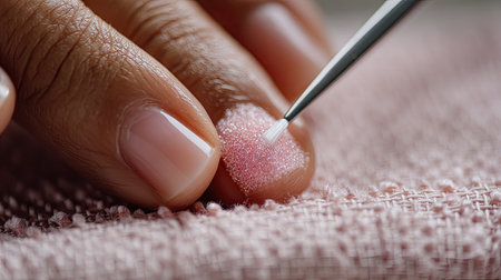 A close-up shot showcasing a person's finger delicately applying a pink material onto a textured fabric using a precision tool, highlighting the artistry involved.