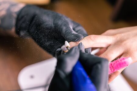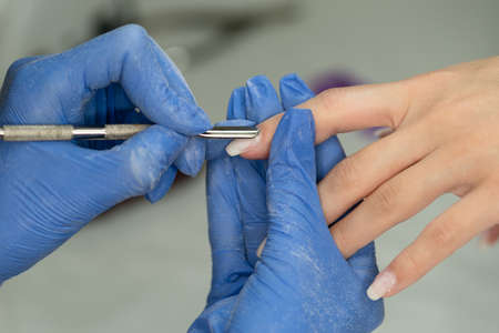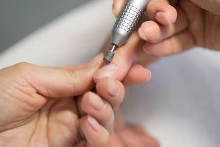 Closeup shot of hardware manicure in a beauty salon. Manicurist is applying electric nail file drill to manicure on female fingers.