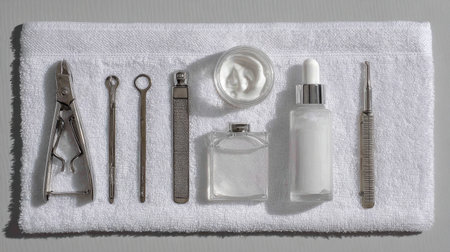 A neat arrangement of grooming tools and skincare products on a white towel, perfect for a beauty routine or spa setting, emphasizing cleanliness and elegance.