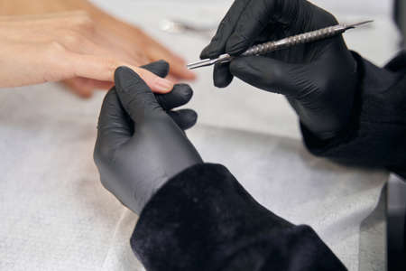 Close up professional manicurist master holding customer hand while using a cuticle pusher in a nail salon