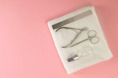 Nail saw, cuticle clippers, nail scissors and hand oil stand on a white towel that stands on a pink background. Top views with clear space