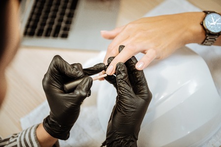Joyful process. Professional experienced nail artist enjoying the process of coloring nails for her client