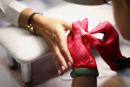 Manicure process in a beauty salon. Hands of the master in sterile gloves polished nails client.