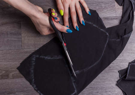 Step by step, Woman dressmaker hands cutting material with scissors on table, mature tailor working in atelier, textile industry, hobby, workspace. Creation process DIY, Workplace of seamstress.