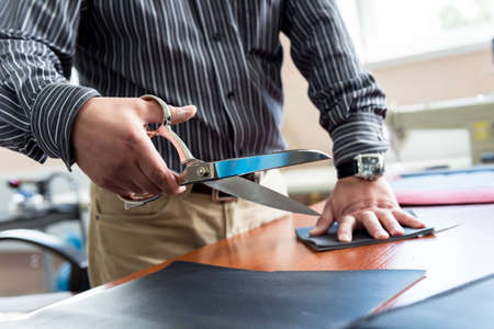 Craftsman cutting natural material use scissors. Working process at leather workshop